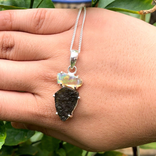 925 Sterling Silver Authentic Moldavite and Opal Gemstone Pendant Gift For Her