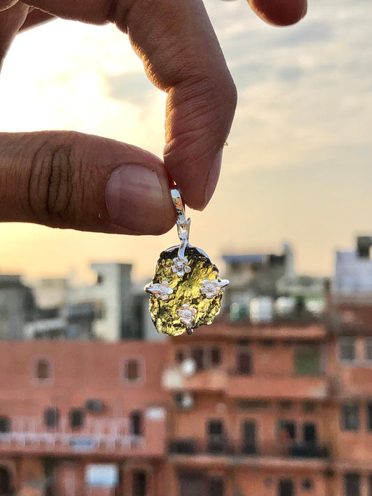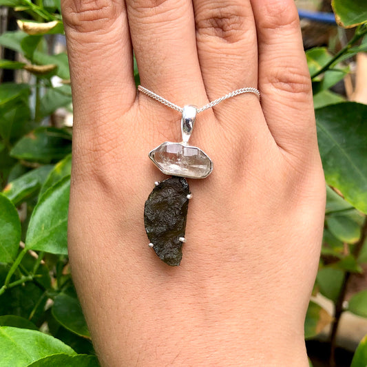 Sterling Silver Authentic Moldavite and Herkimer Diamond Gemstone Pendant Jewelry
