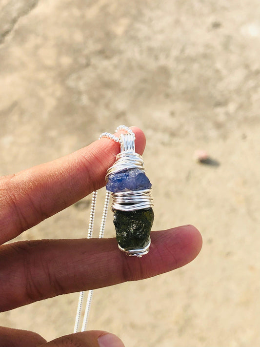 Authentic Raw Moldavite and Tanzanite Gemstone Sterling Silver Pendant Jewelry