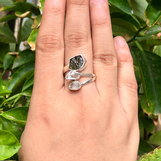 925 Sterling Silver Moldavite and Herkimer Diamond Gemstone Adjustable Design Ring Authentic Czech Moldavite Ring Gift For Her
