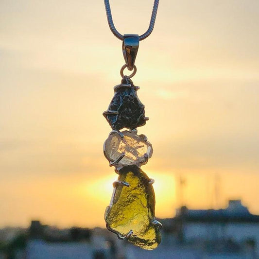 925 Sterling Silver Moldavite, Black Tourmaline and Herkimer Diamond Gemstone Pendant Gift For Loved Ones