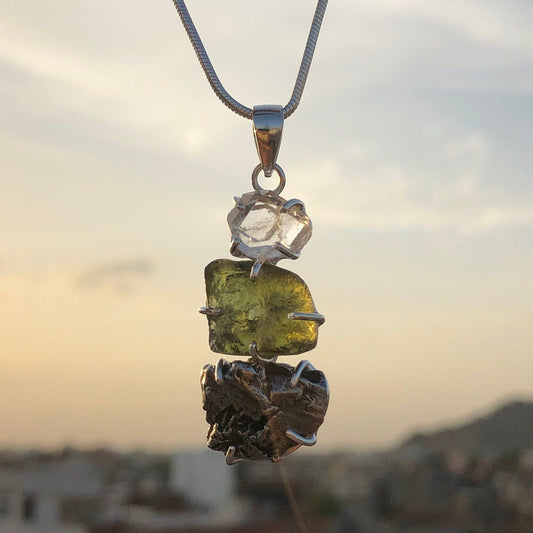 925 Sterling Silver Moldavite, Black Tourmaline and Herkimer Diamond Gemstone Pendant Jewelry For Her